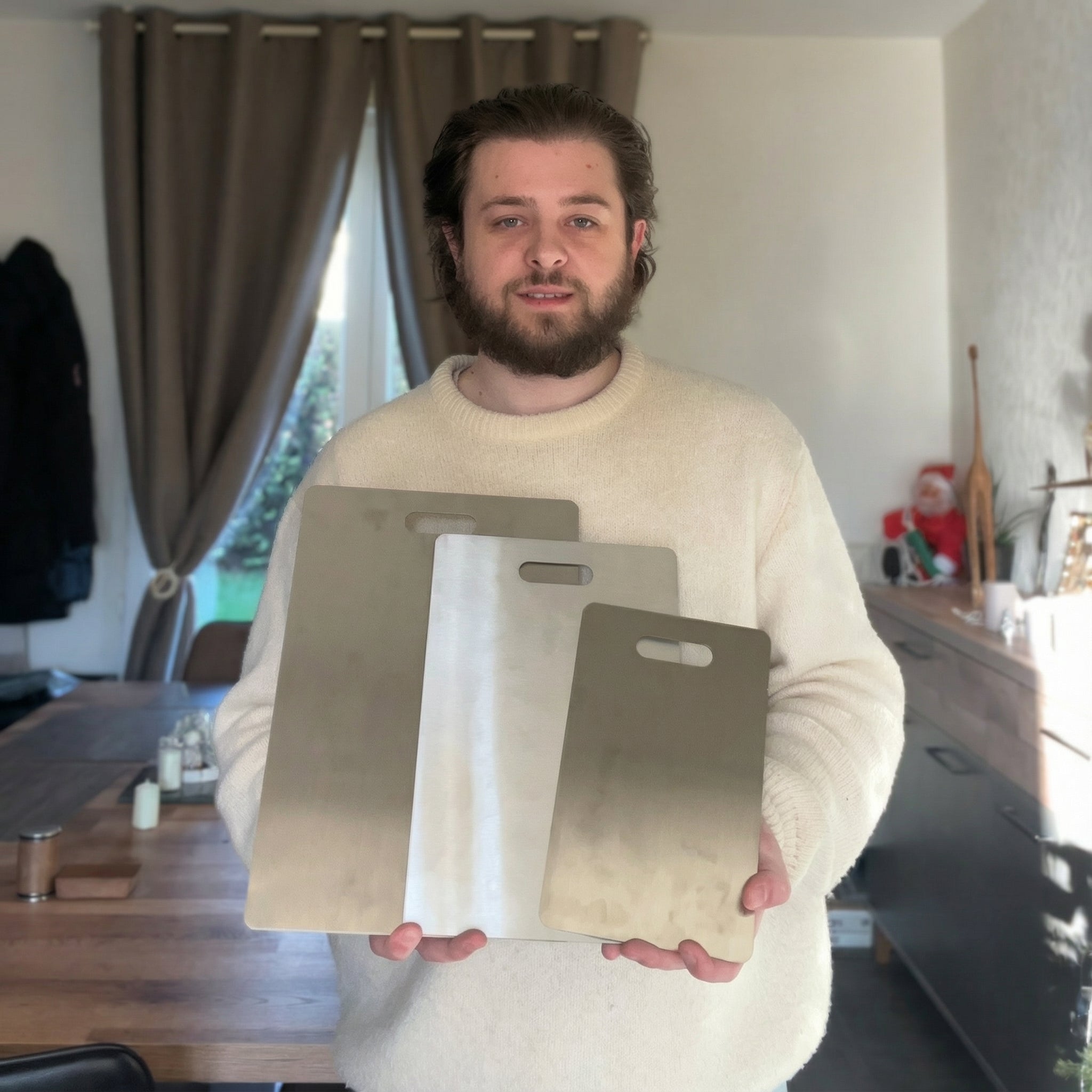 Le cœur de la marque, c’est notre pack de 3 planches en inox (petite, moyenne, grande) pour s’adapter à toutes les découpes, sans multiplier les accessoires inutiles.